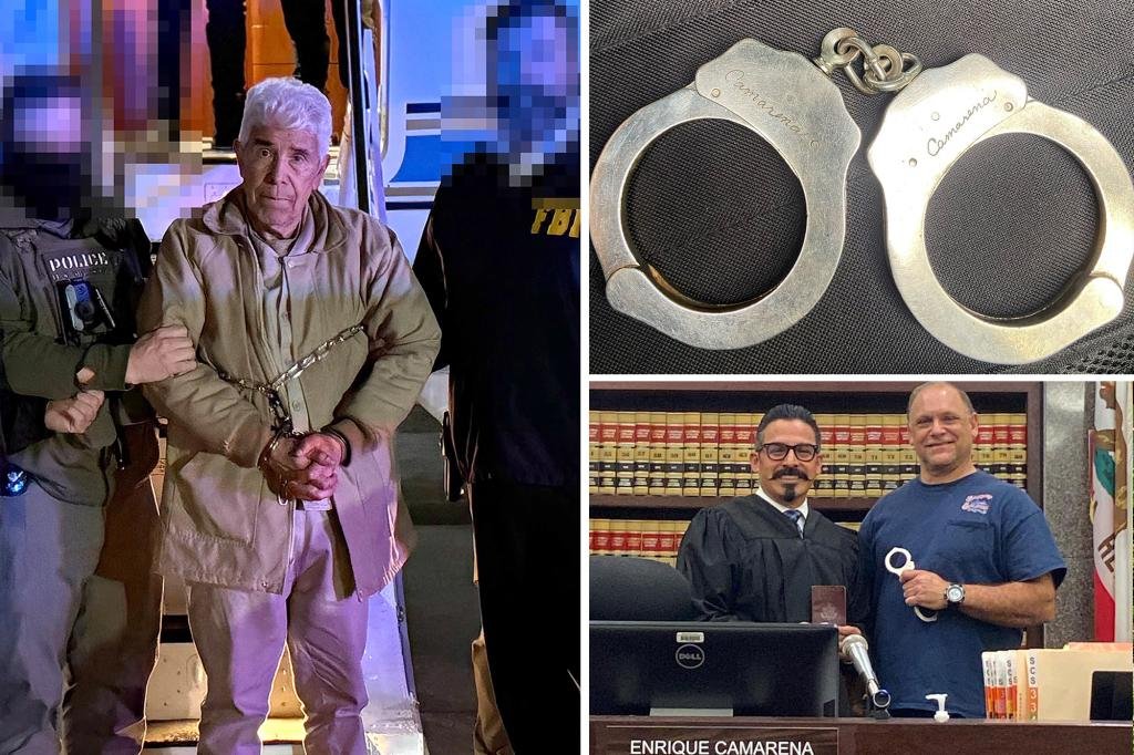 Der Sohn von Camarena, Enrique Camarena, ein Richter in der Gegend von San Diego, Machen Sie mit dem DEA -Agenten Steve Paris FotosEr war stolz darauf, eine ikonische Manschetten zu halten, bevor sie sich an die Verhaftung von Caro Quintero gewöhnten.