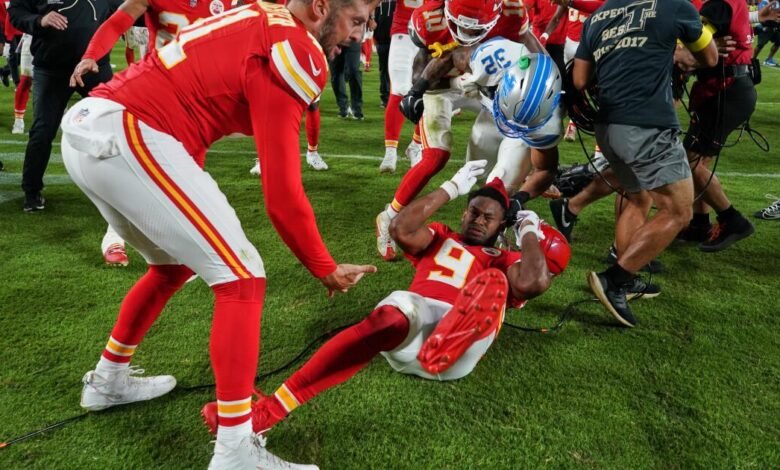 Brian Branch, Detroits Defensive Back Ich glaube, er wurde illegal als Quarterback geblockt. Während der 30:17-Niederlage der Lions gegen die Kansas City Chiefs am Sonntag wurde von den Offiziellen keine Strafe verhängt.