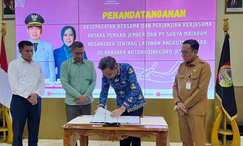Der Jember-Regent Muhammad Fawait und der stellvertretende kaufmännische Direktor von PT Surya Mataram Nusantara, Ary Mercyanto, unterzeichneten eine gemeinsame Vereinbarung und Kooperationsvereinbarung über Luftverkehrsdienste am Flughafen Notohadinegoro in Jember.