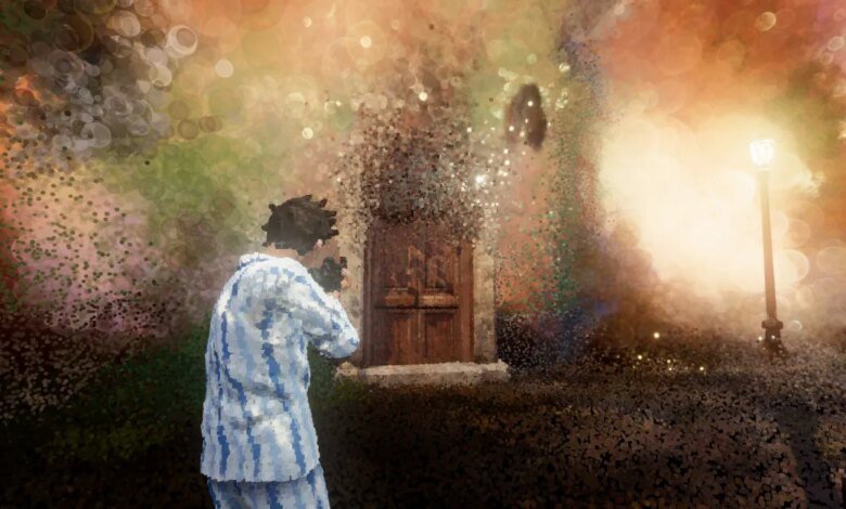 Q-Games sagt Die Träume eines anderen ist ein „Third-Person-Erkundungs-Action-Spiel“, aber es ist einfacher, das Spiel als eine Reihe von Geschichten zu verstehen und nicht als Genre. Wenn Sie in eine Umgebung fallen Die Träume eines anderenBei diesem Phänomen, das meist plötzlich und unvorbereitet auftritt, werden Teile der Landschaft in eine Gruppe kleiner, bunter Flecken zerlegt. Wenn Sie mit Ihrer Waffe auf die Teile schießen, verfestigen sie sich zu Dingen wie einer Bank, einem Baum, einem Gebäude, einer Person oder einem Schiffswrack. Aber selbst dann bestehen Objekte auf der Welt immer noch aus lose verbundenen Teilen, was den Eindruck erweckt, sie könnten augenblicklich auseinanderfallen, und manchmal beginnen die Dinge tatsächlich auseinanderzufallen.