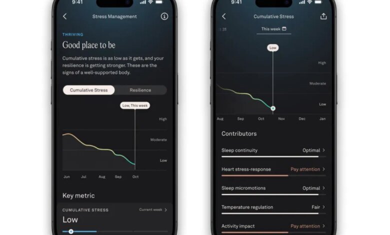 Mit der aktualisierten Oura-App wird eine neue kumulative Stressfunktion eingeführt, die anhand kontinuierlicher Stress-, Schlaf-, Herzfrequenz-, Temperatur- und Aktivitätsdaten einen wöchentlichen Überblick darüber bietet, wie der Körper mit der Bewältigung und Erholung umgeht. Laut Aura werden das Redesign, der kumulative Stress und ein neues Stressmanagement-Dashboard „in den kommenden Wochen“ weltweit auf iOS und Android verfügbar sein.