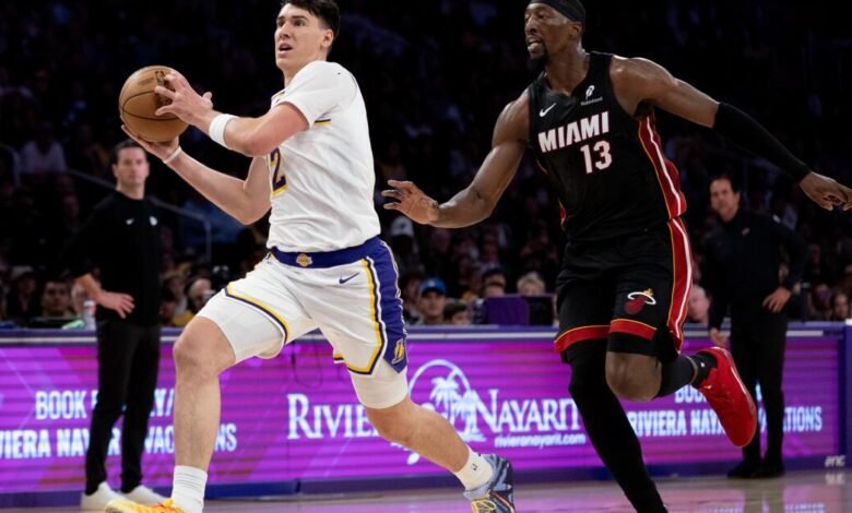 Die Lakers legten am Sonntag 9:35 Minuten vor Ende des vierten Viertels eine Auszeit, um zu versuchen, ein Miami Heat-Team auszubremsen, das den Vorsprung der Lakers um 18 Punkte auf drei Punkte verkürzte. Während der Auszeit liegt der Ball nicht in den Händen von Luka Doncic oder Austin Reaves, sondern von Jake LaRavia.